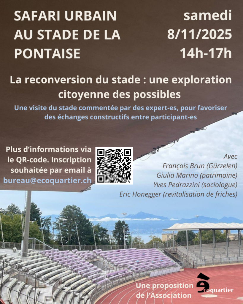Le 8 novembre, l’Association écoquartier organise une balade commentée participative (« safari urbain ») au coeur du Stade de la Pontaise.